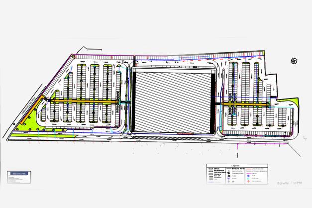Pour ce travail, nous avons effectué un relevé complet du site, repensé et dessiné un tout nouveau parking en tenant compte du nombre de places de parking désiré, de l’écologie et de l’esthétique. Une étude du réseau d’assainissement a également été effectué pour l’évacuation des eaux.